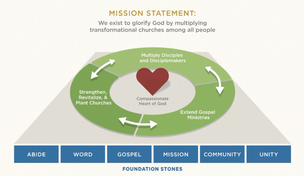 He has a graphic displaying the EFCA Mission Statement: We exist to glorify God by multiplying transformational churches among all people. The graphic has the values as the foundational stones at the bottom and a relationship between discipleship, evangelism/expansion, and strengthening/renewing that looks like this…